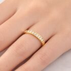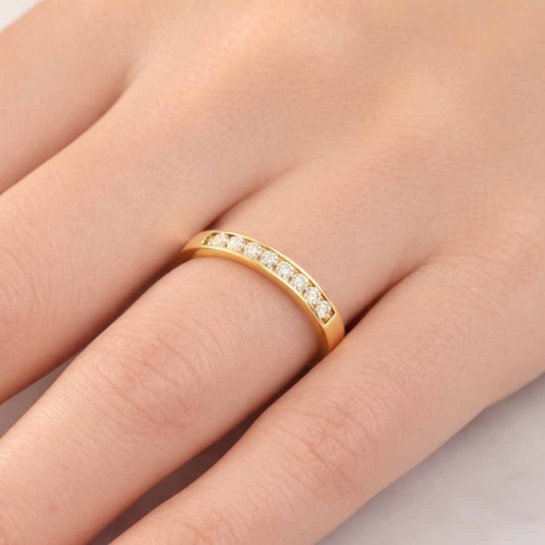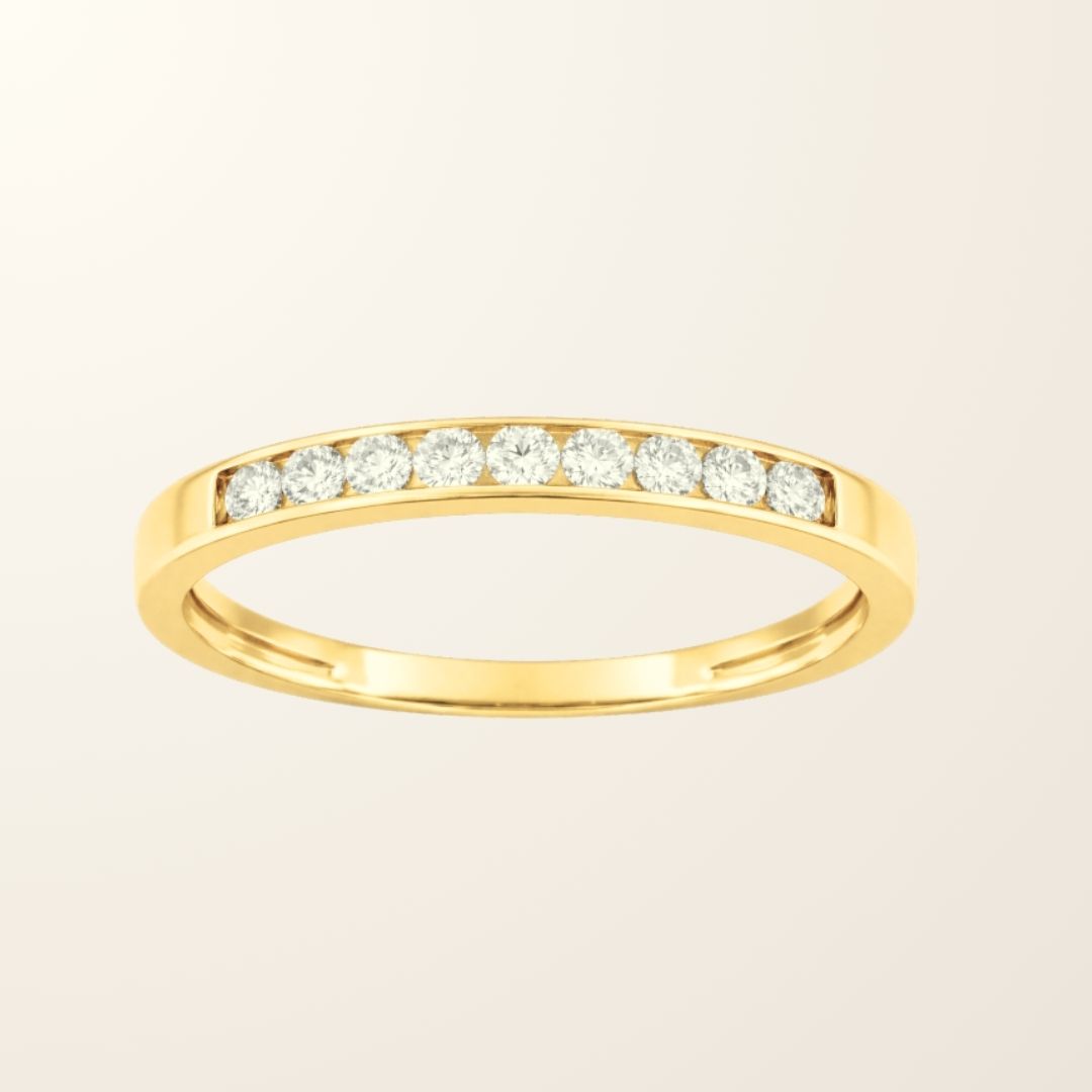 Son anneau est sublimé par une rangée de diamants synthétiques totalisant 0,30 carat, délicatement disposés en serti rail. Cette technique met en valeur la continuité des pierres tout en assurant un maintien sécurisé et un rendu lisse et harmonieux.