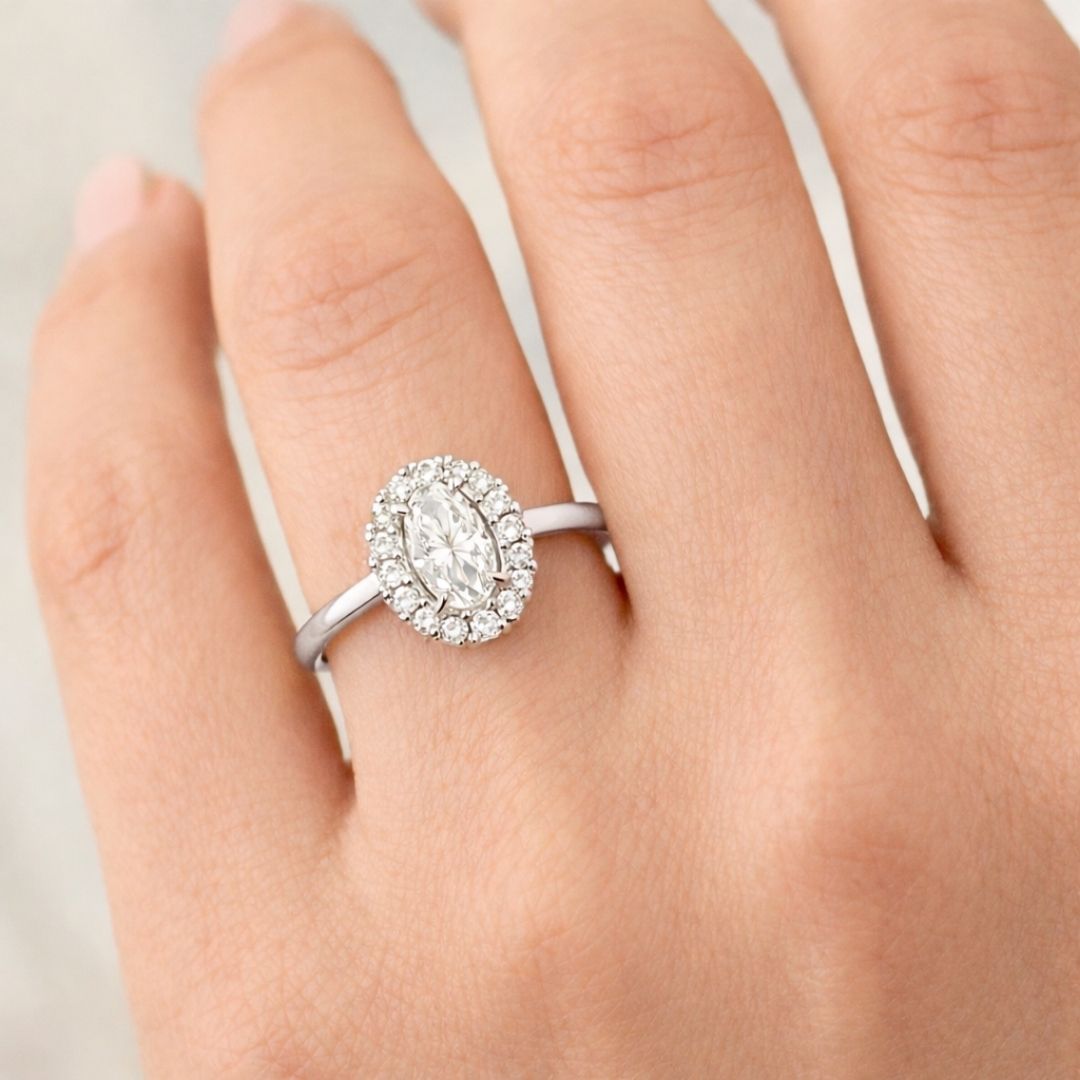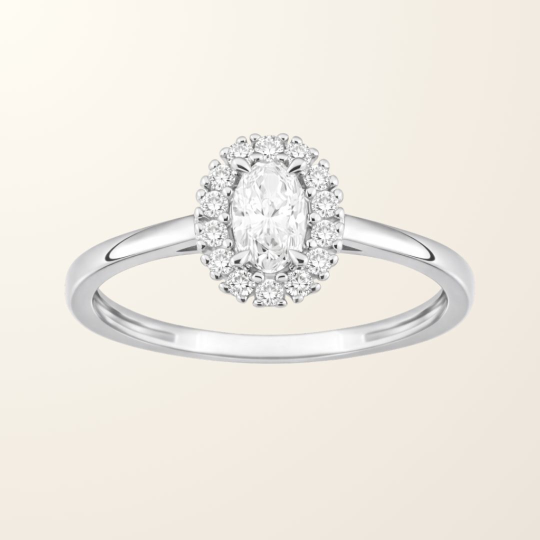 Au centre, une pierre synthétique de 0,20 carat attire le regard par sa brillance exceptionnelle. Elle est sublimée par un entourage de diamants synthétiques, portant le poids total à 0,30 carat. Ce halo lumineux met en valeur la pierre centrale et accentue l’inspiration vintage de la bague.
