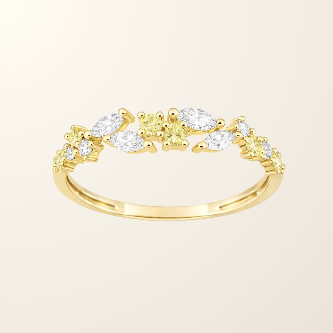 Son anneau fin met en valeur une alternance harmonieuse de diamants ronds et navettes, créant un rythme élégant et aérien. Les diamants synthétiques, pour un total de 0,47 carat, associent des pierres transparentes à des diamants subtilement colorés, offrant un jeu de lumière unique et sophistiqué.