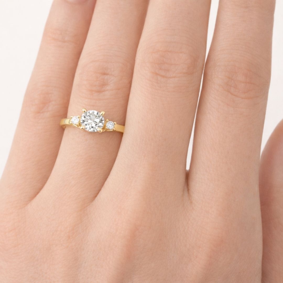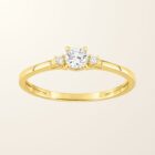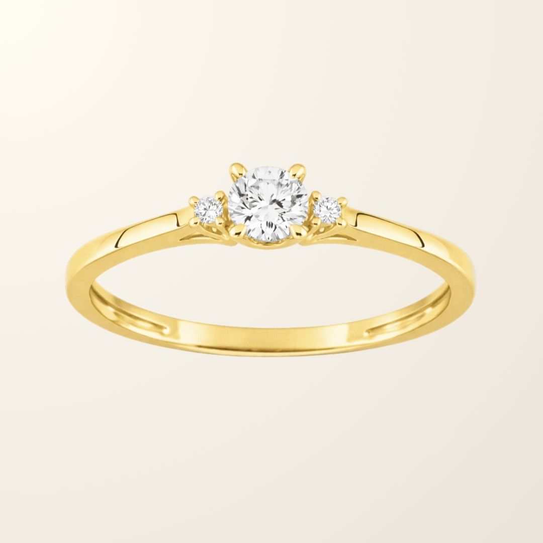 Confectionnée en or jaune 9 carats, cette bague séduit par la chaleur de son métal précieux et l’élégance de sa ligne fine. Son design intemporel met en valeur un diamant central de synthèse de 0,25 carat, sublimé par deux diamants latéraux qui apportent équilibre et brillance.