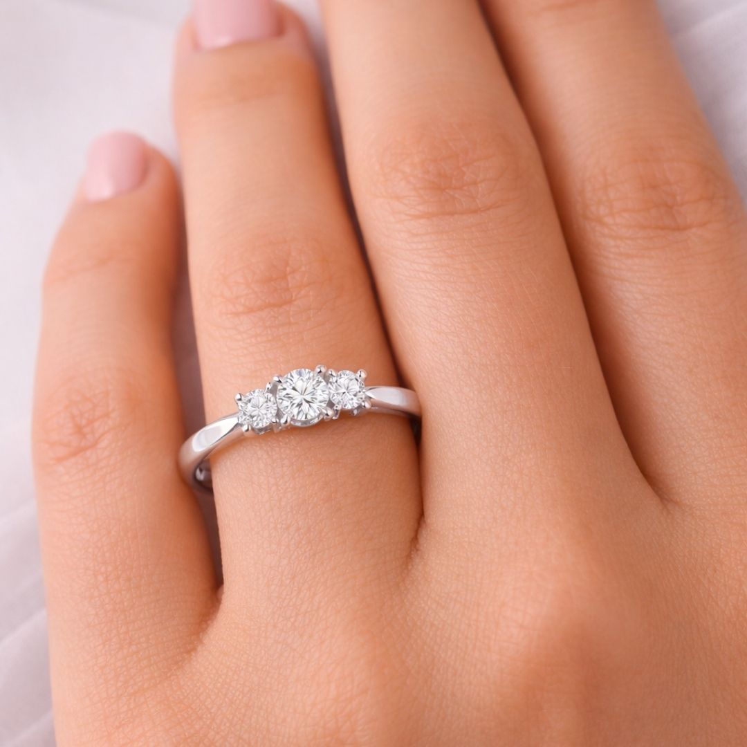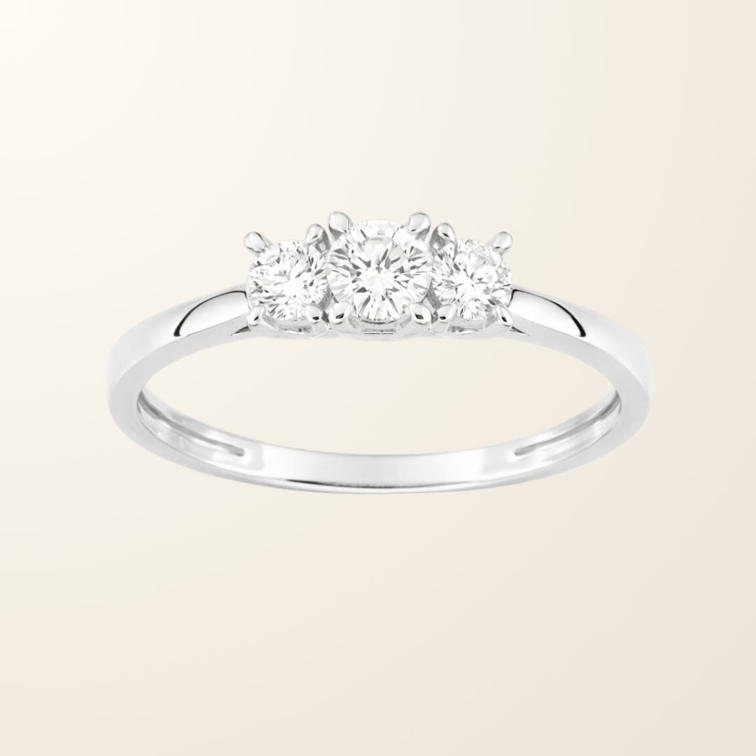 Réalisée en or blanc 9 carats, elle dévoile un diamant synthétique central de 0,15 carat, sublimé par deux diamants latéraux qui accentuent son éclat.