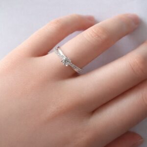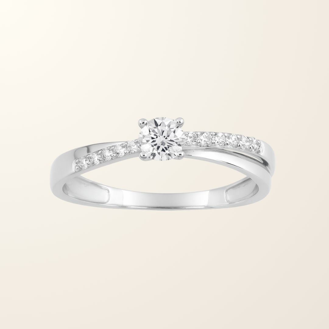 Élégant et intemporel, ce solitaire accompagné en or blanc 9 carats symbolise la promesse d’un amour sincère et durable.