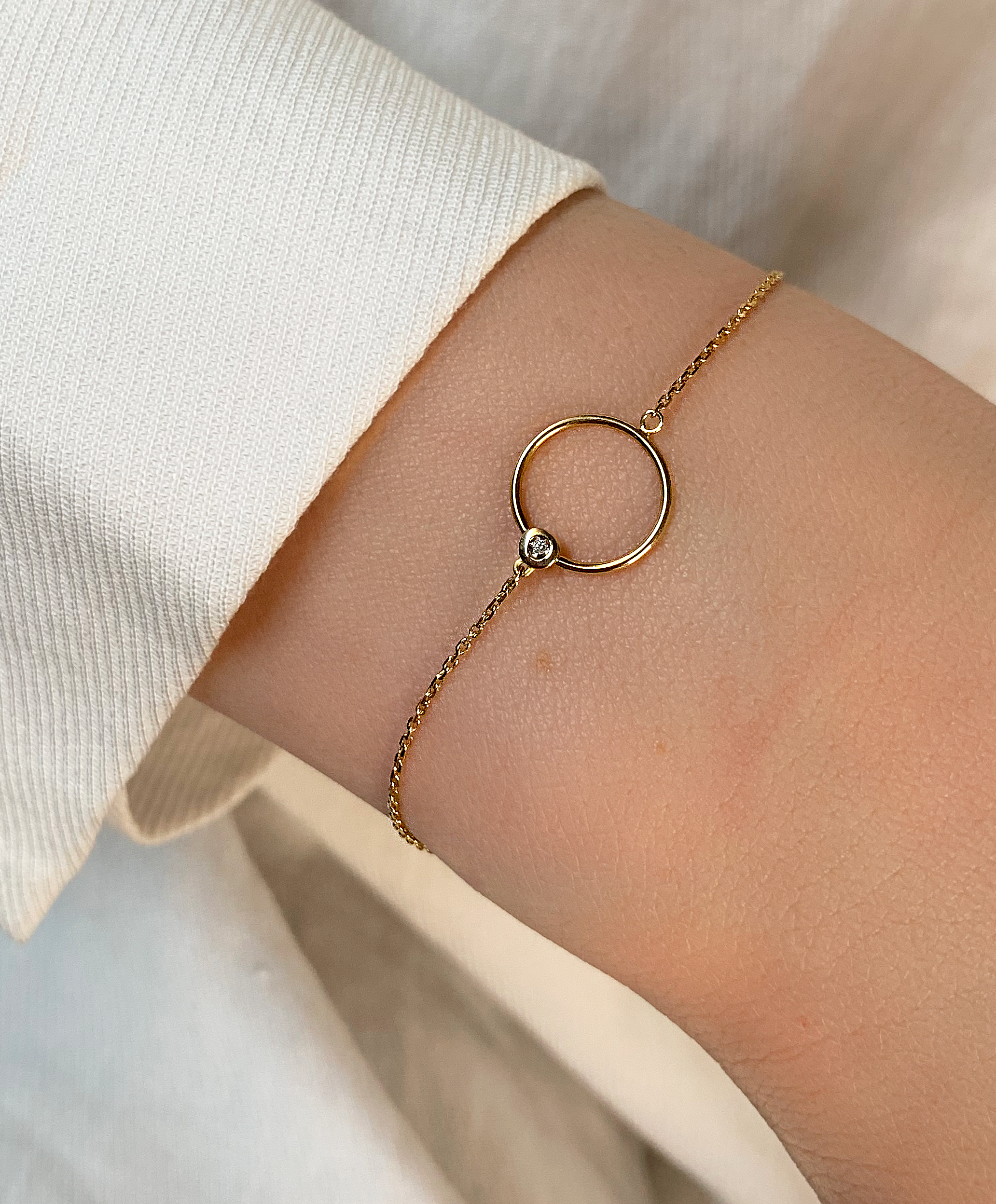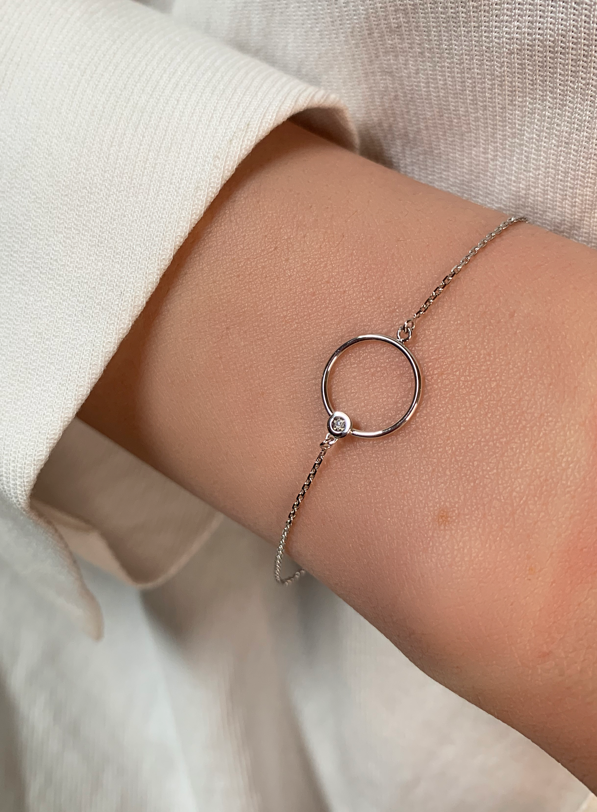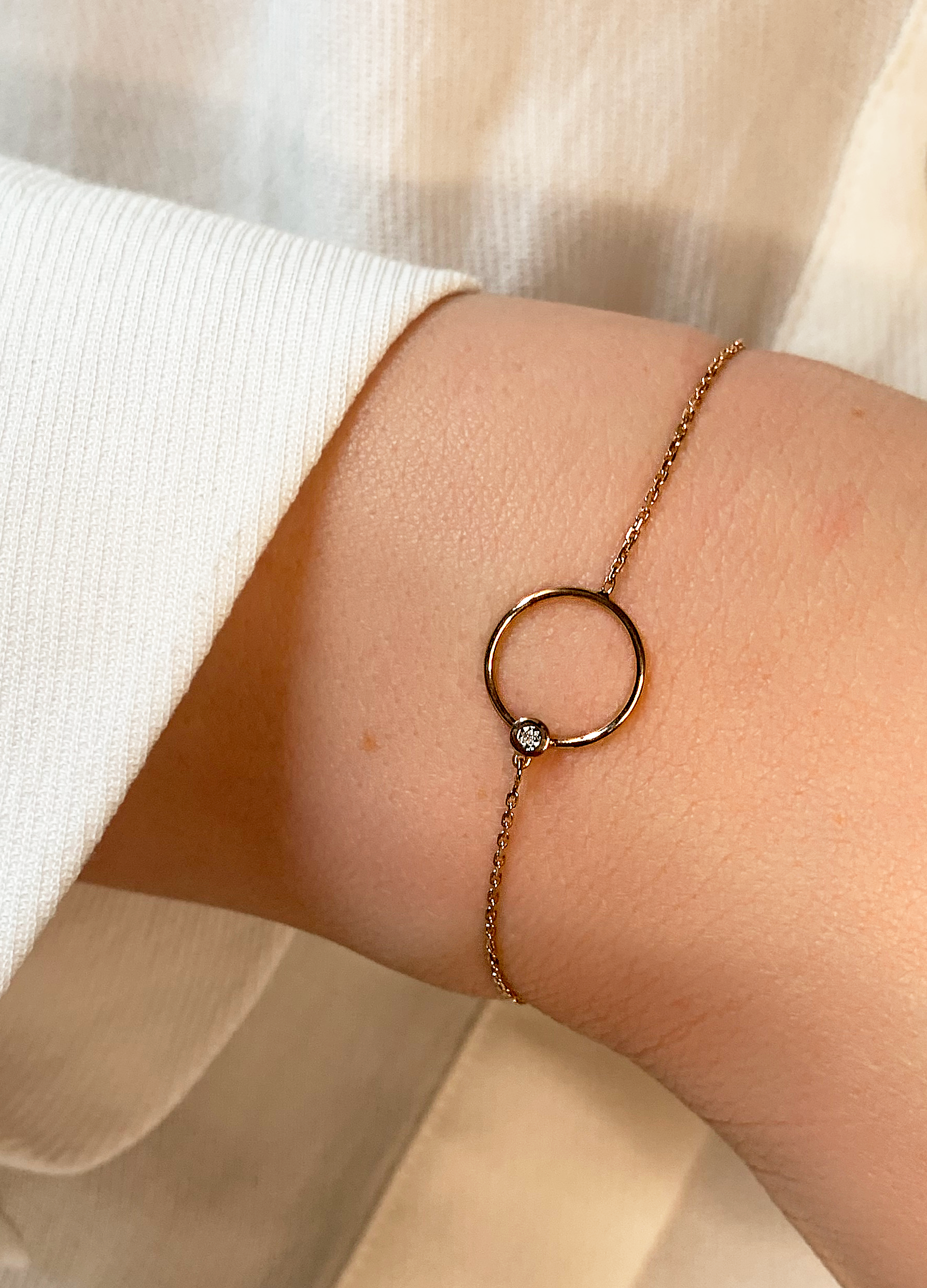 Le bracelet Céléste en or fait penser à un cercle d’amour. Autour du poignet, le cercle semble flotter sur sa chaîne, laissant traverser la lumière entre sa ligne. Accentué par l’éclat d’un diamant, ce modèle devient totalement irrésistible dans toutes les situations.