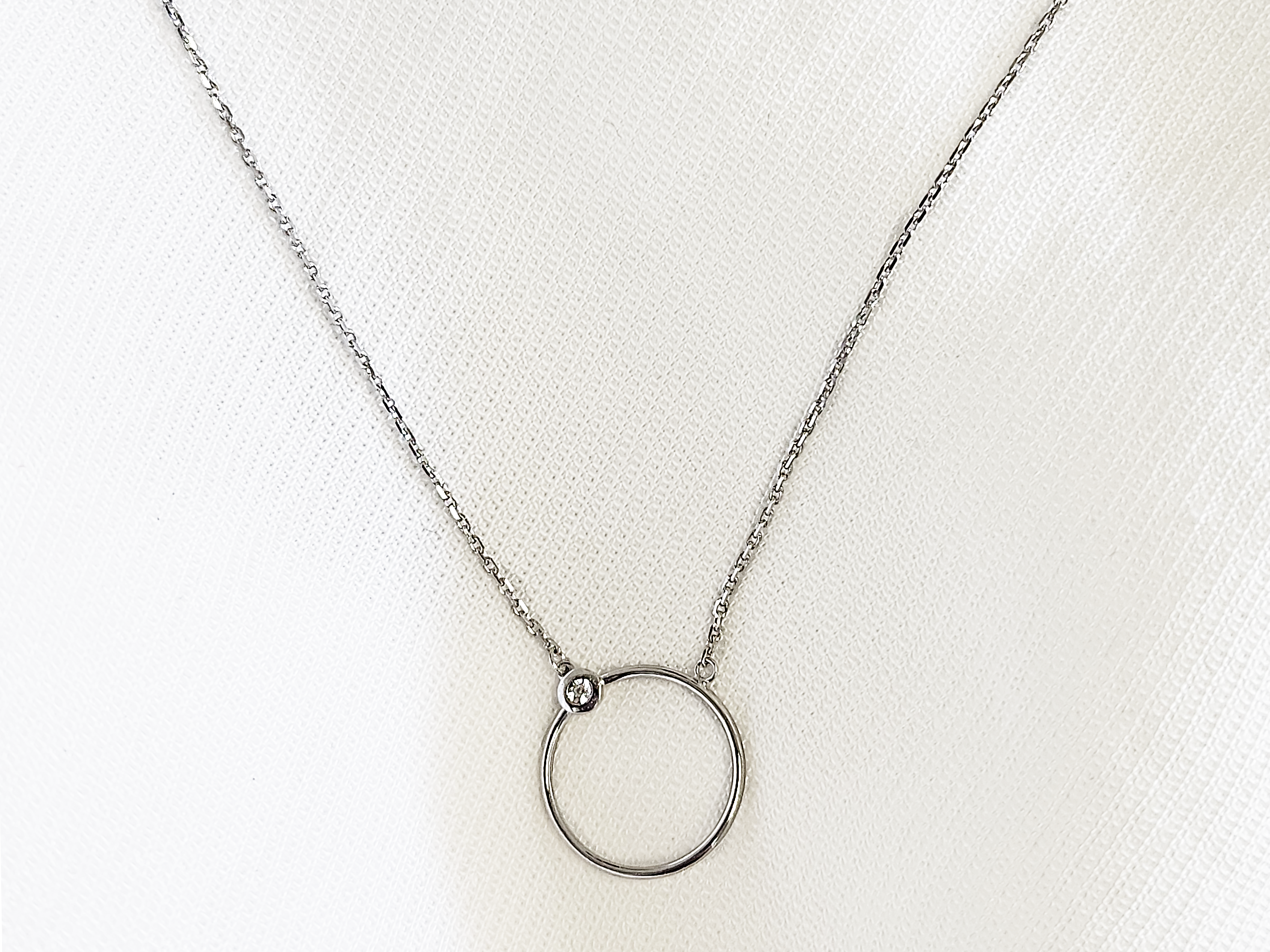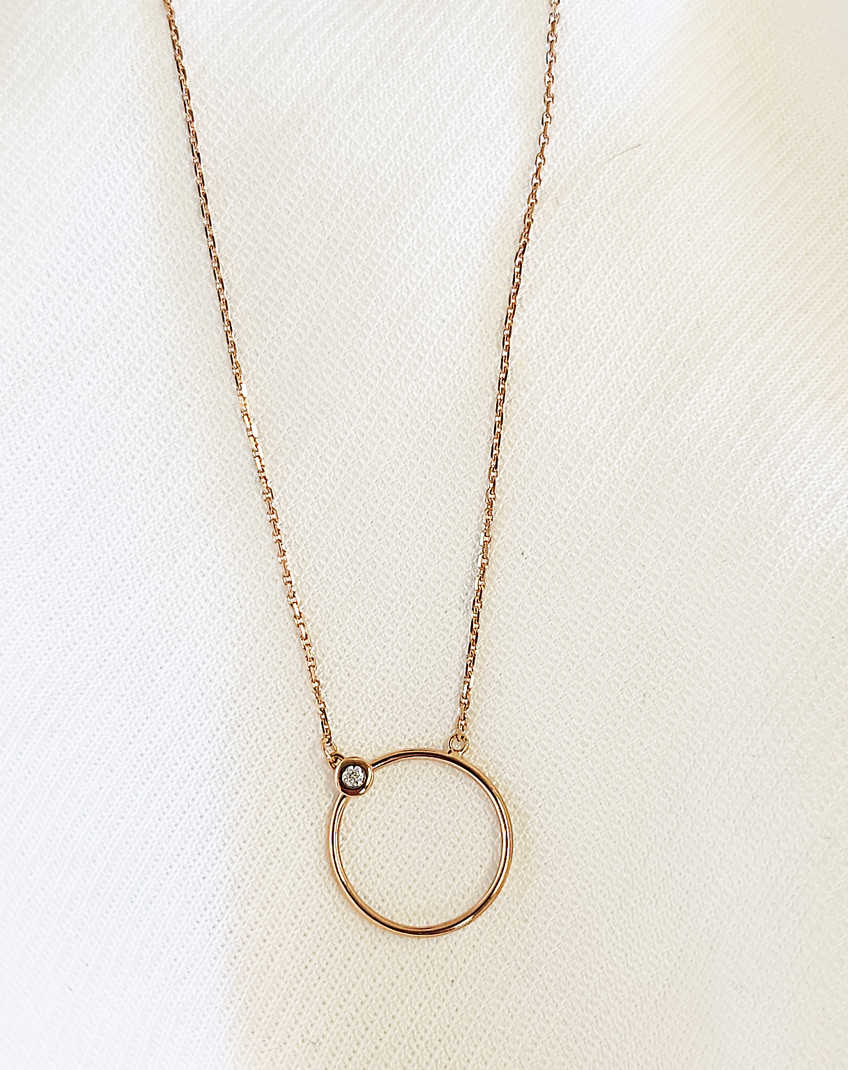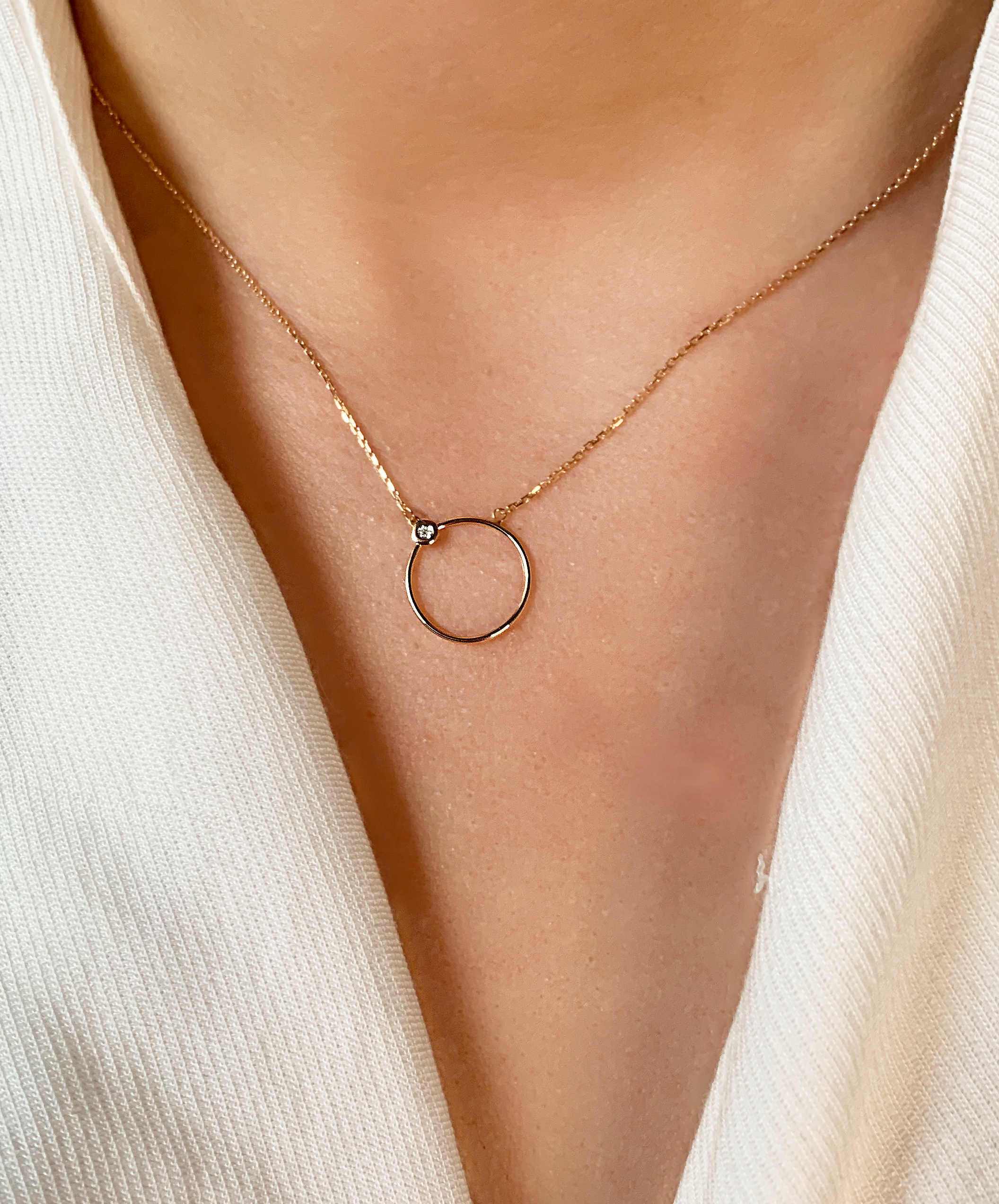 Le pendentif Céléste en or fait penser à un cercle d’amour. Autour du cou, le cercle semble flotter sur sa chaîne, laissant traverser la lumière entre sa ligne.  Accentué par l’éclat d’un diamant, ce modèle devient totalement irrésistible dans toutes les situations.